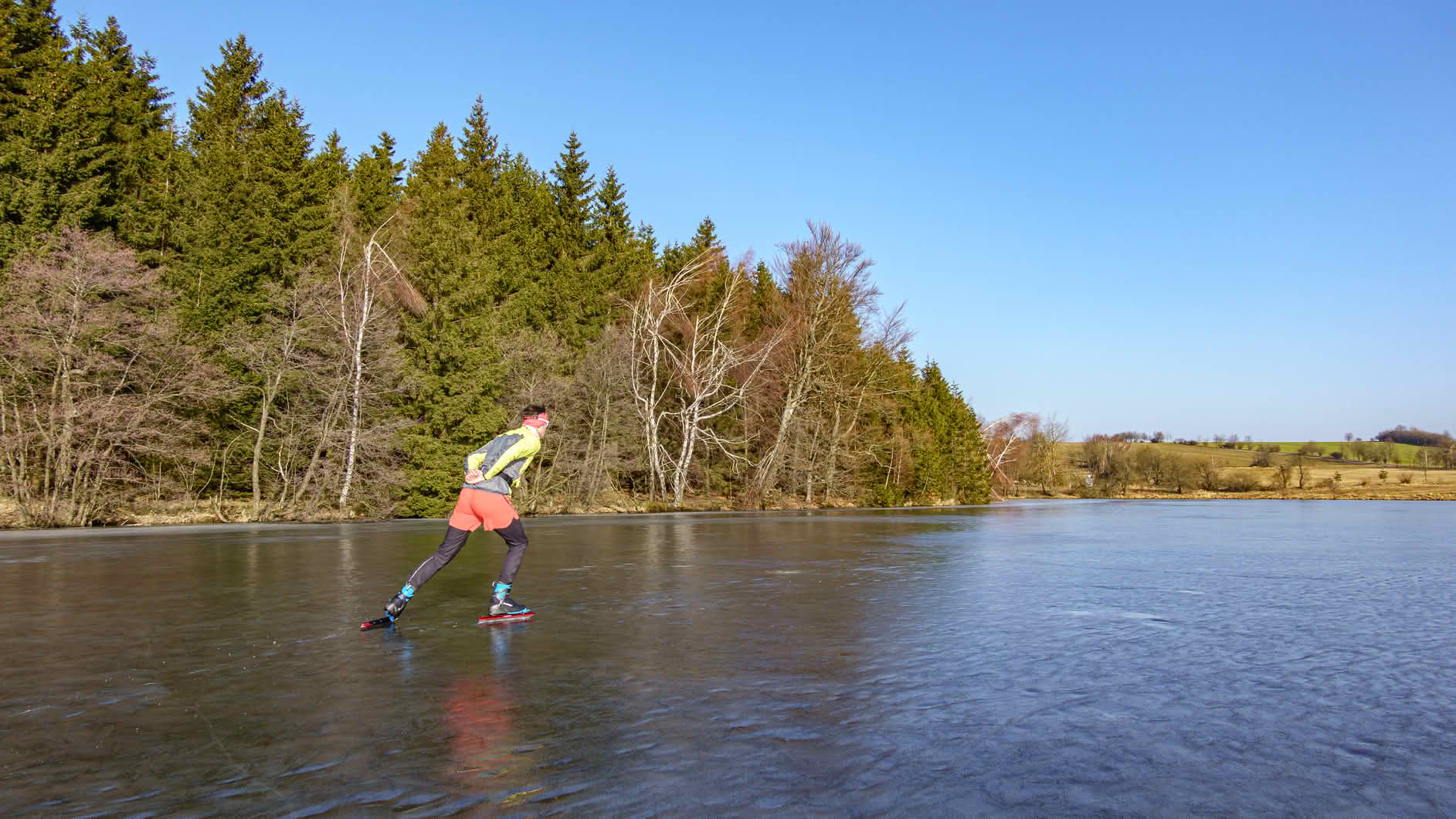 Dopolední, nordické bruslení po zamrzlém, zatopeném lomu Horní Cerekev s nádherně hladkým ledem poslední únorový den.